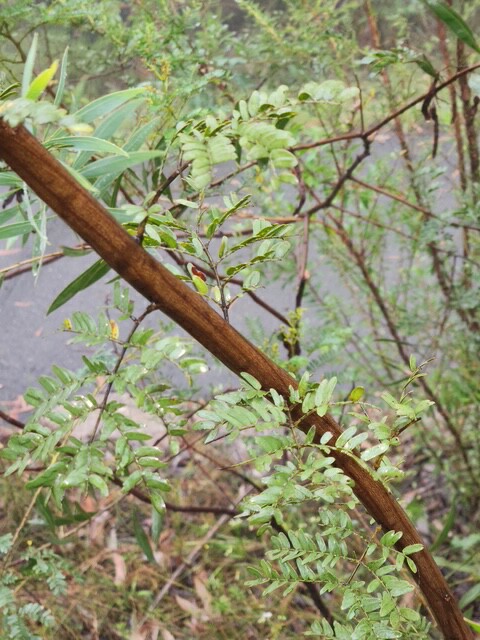 The shrub and herb layers of the woodland are very diverse. We particularly noted Daviesia ulicifolia, Gahnia clarkei, Grevillea laurifolia, Haemodorum planifolium, Hakea teretifolia, Persoonia myrtilloides, Polyscias sambucifolia and Acacia rubida. The latter is unusual in that some bipinnate juvenile leaves persist on the plant, as evident in the photo. Most species of Acacia with phyllodes (modified stems) have no juvenile leaves beyond the seedling stage.