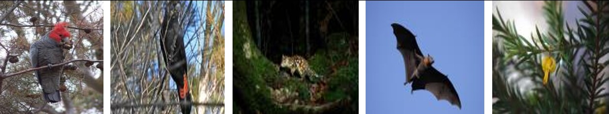 Figure 1: From left to right; Gang Gang Cockatoo, Glossy Black Cockatoo, Spotted-tailed Quoll, Grey-headed Flying-fox, and Needle Geebung. Source: NSW Office of Environment and Heritage (2026).Other threatened species that use the area include the White-throated Needletail, Swift Parrot, Pilotbird, Powerful Owl, Sooty Owl, Little Lorrikeet, Brown Treecreeper, Varied Sitella, Scarlet Robin, Greater Glider, Yellow-bellied Glider, Koala, Eastern Pygmy-Possum and 8 species of bat, such as the Large-eared Pied Bat.