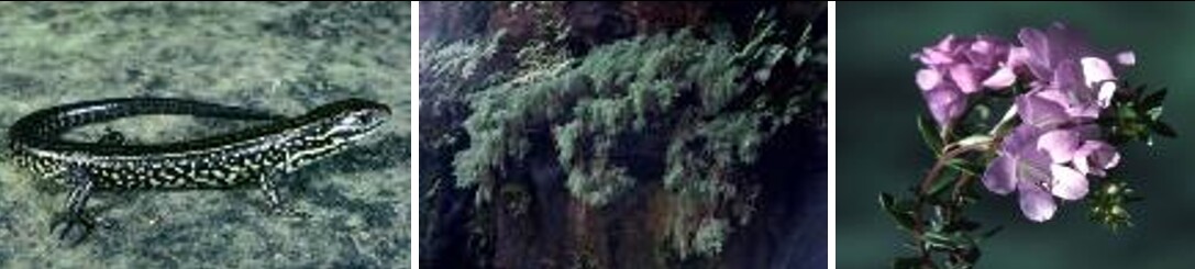 Figure 2: From left to right: Blue Mountains Water Skink, Dwarf Mountain Pine, Blue Mountains Cliff Eyebright. Source: NSW Office of Environment and Heritage (2026).The Giant Burrowing Frog, Giant Dragonfly and Swamp Bush-pea are other threatened species dependent upon waterways and swamps in the area